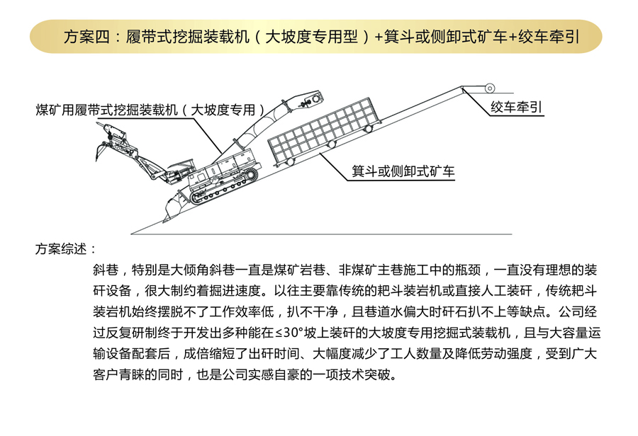 方案四:履帶式挖掘裝載機(jī)+箕斗或側(cè)卸式礦車+絞車牽引